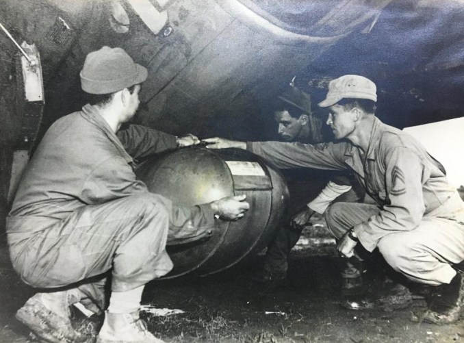 Abaixo: Instalação de tanque auxiliar em aeronave P-47 do 1º Grupo de Aviação de Caça. Aeroporto de Pisa. Sargento Augusto Campagner, de São Paulo, Sargento Pedro Rodrigues da Fonseca, de Juiz de Fora, e Sargento Joseph Telep, dos Estados Unidos.
