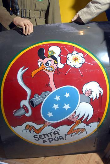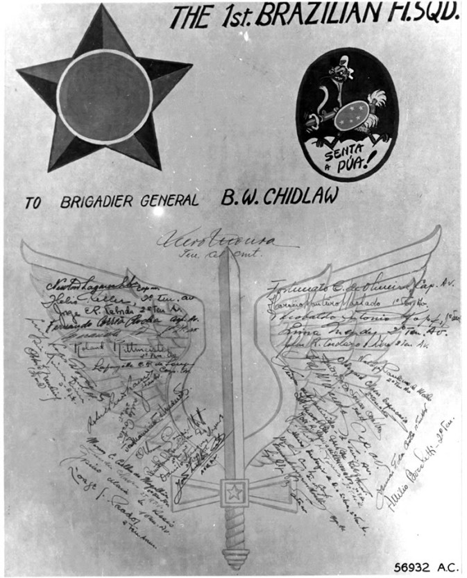 Abaixo: Placa assinada pelos pilotos e demais oficiais brasileiros e oferecida ao General Benjamin Wiley Chidlaw, então comandante do XXII Comando Aéreo Tático, ao qual estava subordinado o 1º GAvCa da FAB.