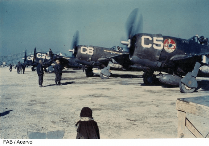 ![]() Acima: Os aviões se preparam para decolar. Quatro P-47s do 1º Grupo de Aviação de Caça em ação na Itália REPRODUÇÃO / HERÓIS DE LOS CIELOS