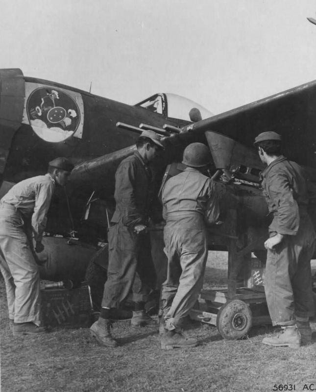 ![]() O P-47 foi eficaz em combate aéreo, mas se mostrou especialmente hábil no ataque ao solo. Estava armado com oito metralhadoras calibre .50, quatro em cada asa. Com carga total, pode pesar até oito toneladas.