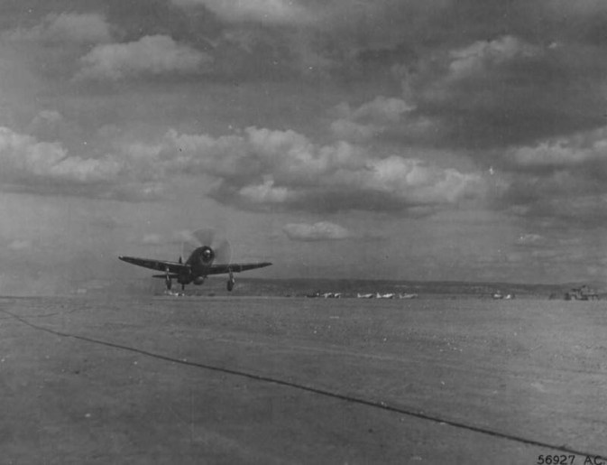 Em 6 de outubro de 1944, o Grupo de Caça desembarcou no Teatro de Operações, no porto de Livorno, na costa oeste da Itália; de lá viajou, de trem, para Tarquinia, seu primeiro aeródromo de destino; lá recebeu seus aviões P-47 “Thunderbolt”, totalmente novos e já pintados com as cores brasileiras; lá ele se juntou ao 350º Regimento de Caça da América do Norte, que tinha 3 outros Grupos de Caça com pessoal americano; Lá realizou os primeiros voos de experiência de seus aviões e reconhecimento da região.