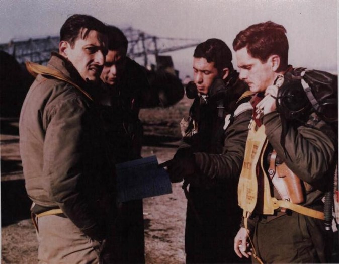 ![]() Acima: Pilotos brasileiros antes da decolagem. Da esquerda para a direita estão os únicos dois sobreviventes do 1º Grupo de Aviação de Caça, Brigadeiro Rui Moreira Lima (na esquina; 94 missões de combate na Itália) e Brigadeiro José Rebelo Meira de Vaconcelos ACERVO BRIGADEIRO MEIRA