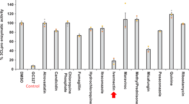 - Um estudo canadense-americano mostrou que a ivermectina bloqueou a enzima principal para a replicação de Sars-CoV-2 (3CLpro) de forma muito eficaz (> 90%) .