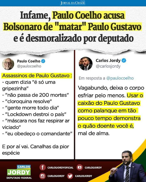 RS Notícias: Infame, Paulo Coelho acusa Bolsonaro de “matar” Paulo Gustavo e é desmoralizado por deputado Lucio Borges Sem categoria 7 de maio de 2021 1 minuto https://www.jornaldacidadeonline.com.br/noticias/29311/infame-paulo-coelho-acusa-bolsonaro-de-equotmatarequot-paulo-gustavo-e-e-desmoralizado-por-deputado Fonte: RS Notícias: Infame, Paulo Coelho acusa Bolsonaro de “matar” Paulo Gustavo e é desmoralizado por deputado Compartilhe isso: Compartilhar no X(abre em nova janela) 18+ Compartilhar no Facebook(abre em nova janela) Facebook Curtir Carregando... Relacionado Publicado por Lucio Borges Editor do site RS Notícias. Ver todos os posts de Lucio Borges Publicado 7 de maio de 2021