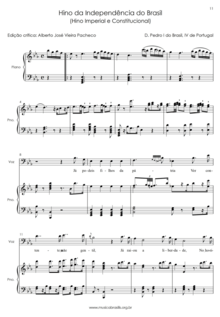 Hino da Independência, de D. Pedro I (1a página da partitura). Partitura completa disponível no portal Musica Brasilis