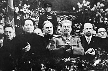Os regimes de estilo soviético que surgiram no bloco não apenas reproduziram a economia planificada soviética, mas também adotaram os métodos brutais empregados por Josef Stalin e pela polícia secreta soviética, a fim de suprimir a oposição real e potencial.[56] Na Ásia, o Exército Vermelho havia invadido a Manchúria no último mês da guerra e ocupou a grande faixa do território coreano localizado ao norte do paralelo 38.[57]