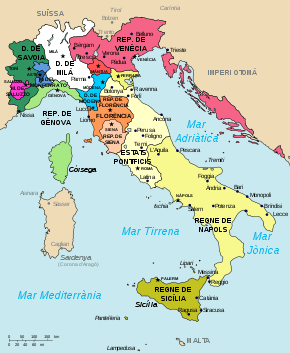 Durante o Renascimento, as cinco principais potências na península Itálica eram o Ducado de Milão, a República de Veneza, a República Florentina, o Reino de Nápoles e os Estados Papais.[5] A maior parte dos Estados da península era ilegítima, tomados por mercenários chamados condottieri.