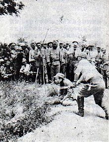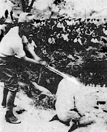 Um prisioneiro de guerra chinês prestes a ser decapitado por um oficial japonês com uma shin gunto