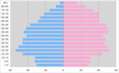 Pirâmide etária da população estoniana. Em azul os homens, em rosa as mulheres. A base estreita revela a taxa baixa de nascimentos.