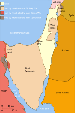 A Guerra do Yom Kippur (1973) começou quando Egito e Síria lançaram um ataque surpresa em conjunto, no dia do jejum judeu, no Sinai e nas Colinas de Golã. Os egípcios e sírios avançaram durante as primeiras 48 horas, após o que o conflito começou a balançar em favor de Israel. Na segunda semana da guerra, os sírios foram completamente expulsos das Colinas de Golã. No Sinai ao sul, os israelitas atacaram o ponto de encontro de dois exércitos egípcios invasores, cruzaram o Canal de Suez (antiga linha de cessar-fogo), e cortaram todo o exército egípcio assim que um cessar-fogo das Nações Unidas entrou em vigor. As tropas israelitas finalmente retiraram-se da região oeste do canal e os egípcios mantiveram as suas posições sobre uma estreita faixa no leste permitindo-lhes a reabrir o Canal de Suez e clamar a vitória.