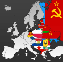 Em 1945, com a economia arruinada, e as milhões de mortes resultado de “três anos de guerra em solo soviético” (ver: Grande Guerra Patriótica), a União Soviética emerge como a segunda maior potência do mundo e controla todo o Leste Europeu.[2]